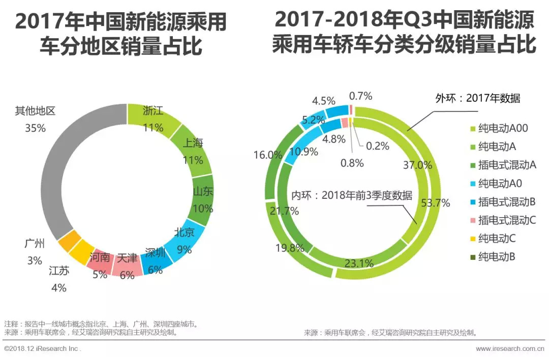 分类分级销量方面,A00级纯电动轿车进入2018年后销量下滑超过15个百分点。纯电动A级轿车、插电式混动A级轿车绝对销量增长迅速,B级、C级新能源乘用车仍有极大的增长空间。车型的丰富和补贴“退坡”将为较高级别的乘用车带来市场机会。