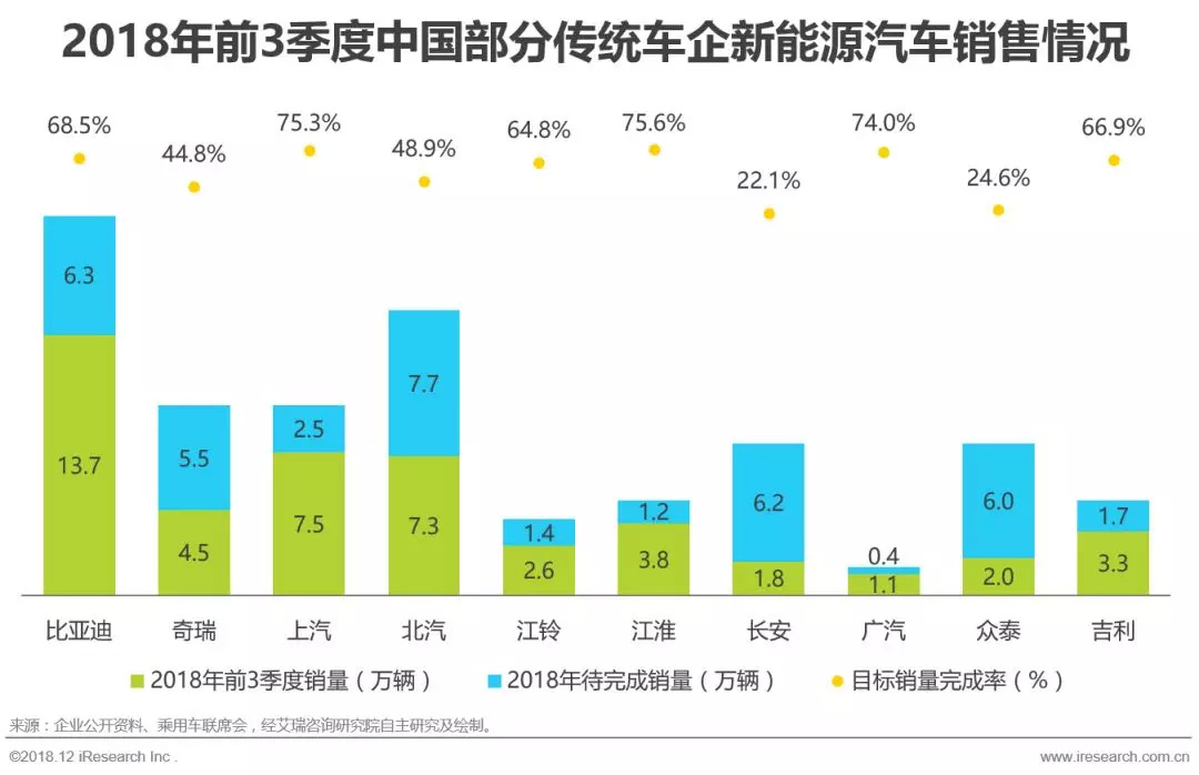 尽管2018年新能源乘用车市场保持了良好的增长势头,部分传统自主品牌的销售情况仍未达预期目标:首先,部分企业销售目标激进,对市场变化因素考虑不足,导致销售目标过高,实现难度大;其次,部分企业车型产品组合单薄,尤其是以低续航里程的小微车型作为主推产品的企业遭遇了补贴力度下降的变化,销量受损。比亚迪、北汽、上汽、吉利和奇瑞等品牌依旧极具竞争力,传统自主品牌市场格局无显著变化。