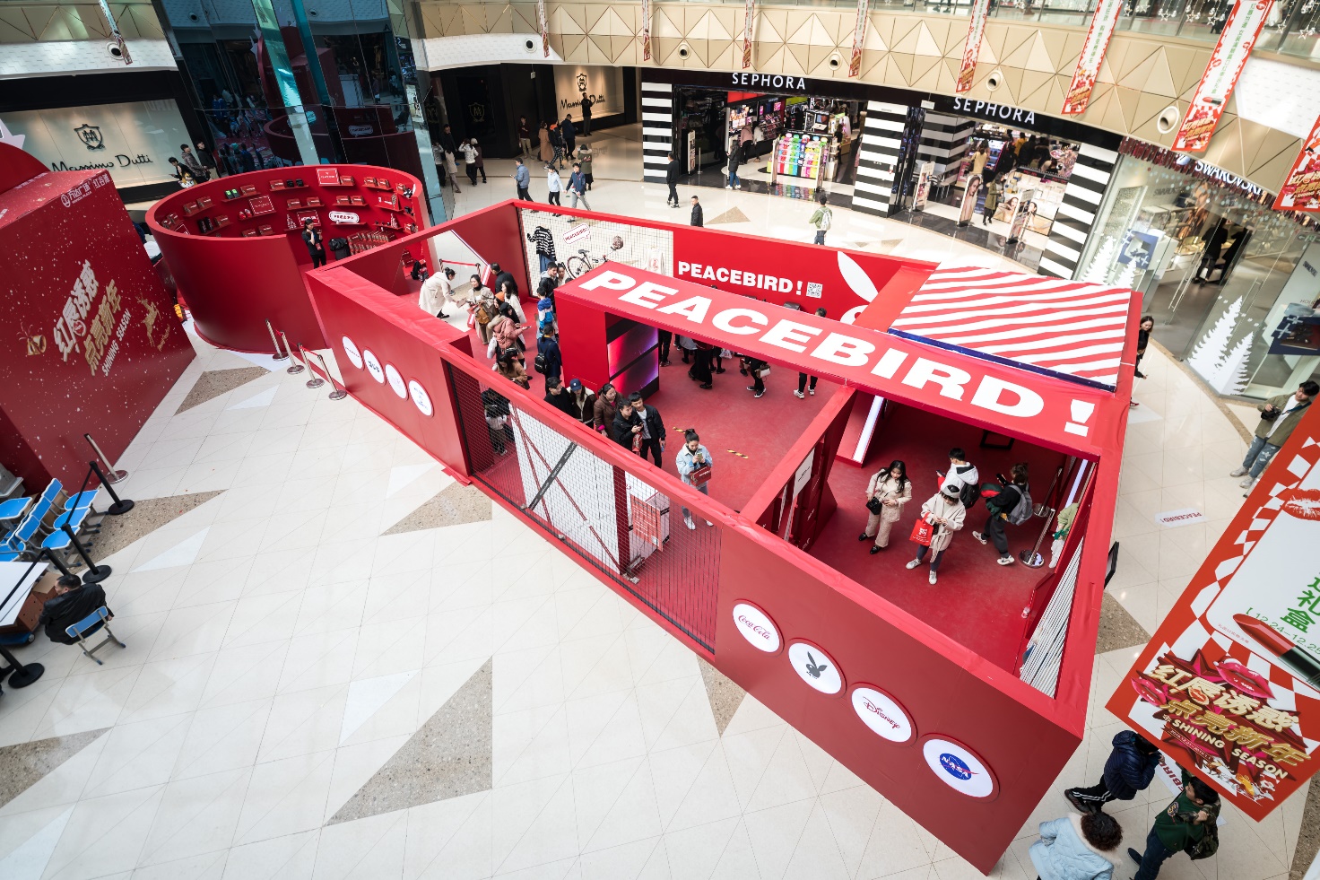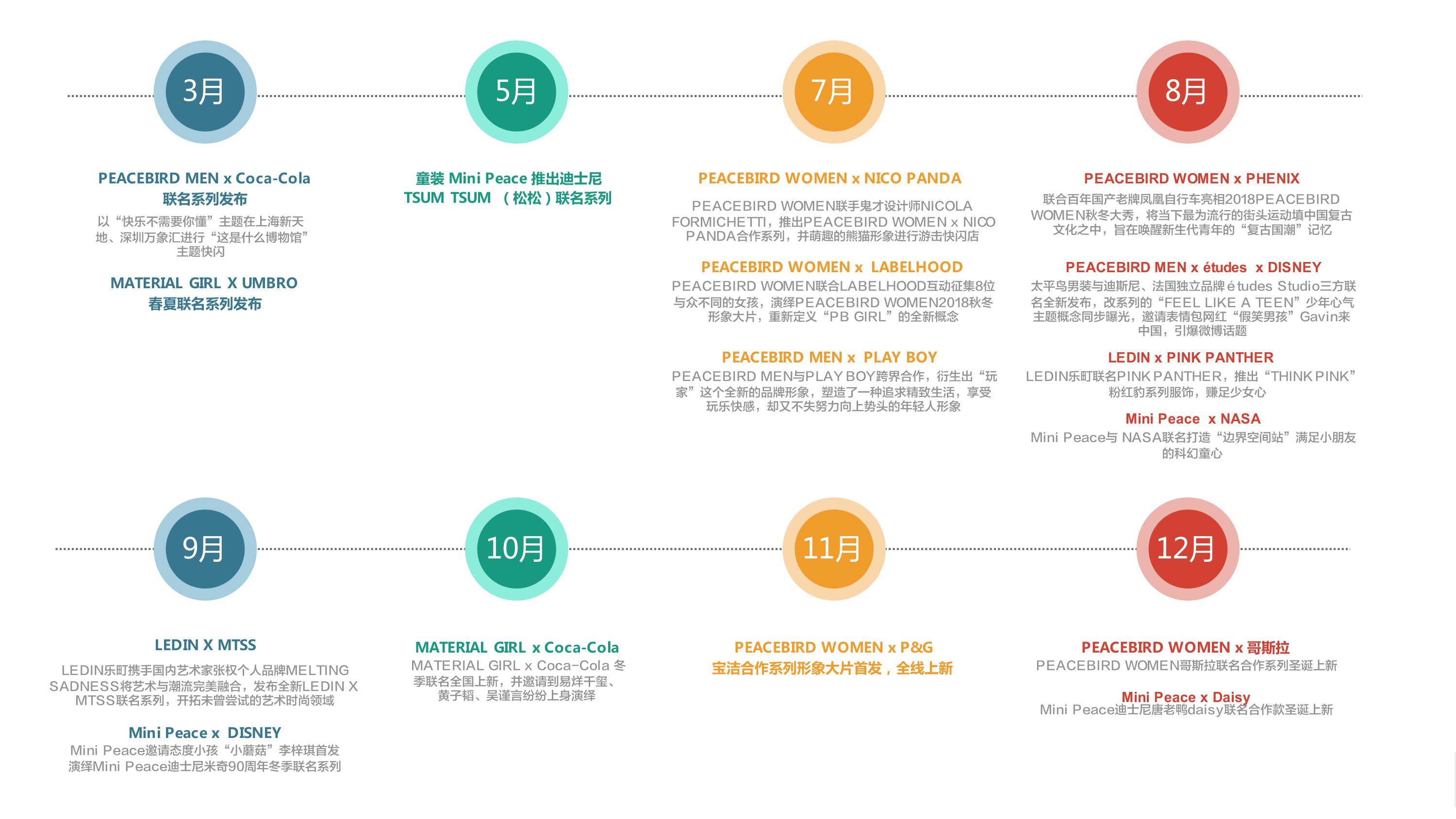 9月,太平鸟PEACEBIRD旗下49家品牌店铺联合浙江省内17座万达,助力万达入浙12年的首届浙江万达狂欢购物节,并于24日“太平鸟超级品牌日”当天创造81.8万元的销售业绩。12月21日至25日,太平鸟集结旗下69家品牌门店联合中南区29座万达广场,玩转节庆营销,开启渠道营销新玩法。