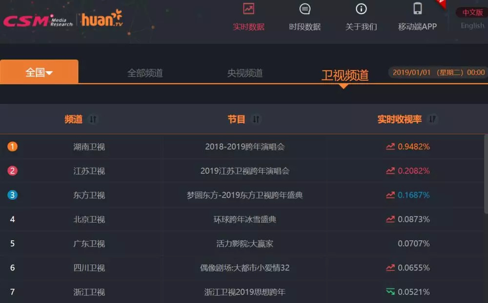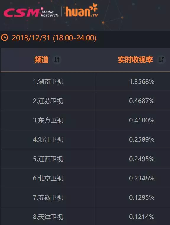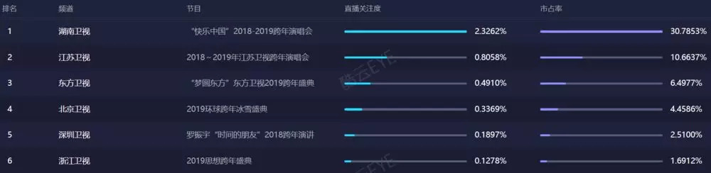 在新旧两年交汇之际,湖南卫视的零点实时收视为0.95%,直播关注度为2.33%,市占率30.79%,均遥遥领先于其他卫视。