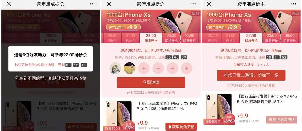 得益于此收视保障,拼多多这一仗,可谓拼得值得。在庞大的粉丝基础上,拼多多利用其流量进行社群裂变。观看直播的观众,必须先下载拼多多App,分享至社群中邀请6位好友,才可获取团购iPhone的资格。20点至次日0点,每个时段均有一次机会,抢购前5分钟邀请截止。22时的时段中,34495人获得了抢购资格。