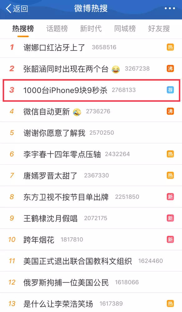 从18时至24时的收视数据可见,湖南卫视、江苏卫视、东方卫视分别位列前三,实时收视率为1.36%、0.47%、0.41%。拼多多恰为三大卫视的赞助商,借力跨年晚会的关注度,拼多多App的下载量突增。23时,“1000台iPhone 9块9秒杀”出现在了微博的热搜推荐位上。在广告营销方面,上市后的拼多多不惜血本。