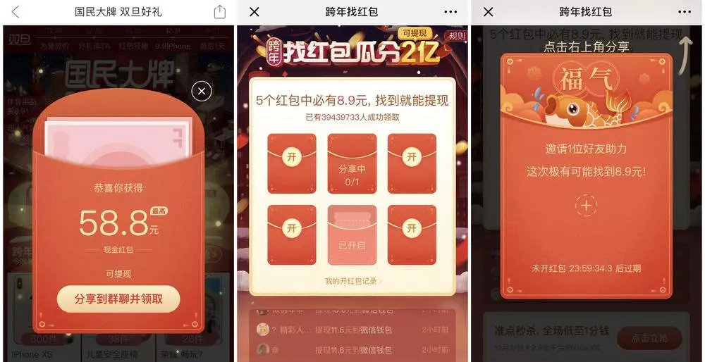 瓜分红包的玩法同理。用户进入红包界面后,会得到一个58.8元的可提现红包,它会被分割为几个小红包。每提现一个小红包,用户需在6个红包中盲猜,也需让好友助力。同样地,好友必须下载App,该用户才算分享成功。