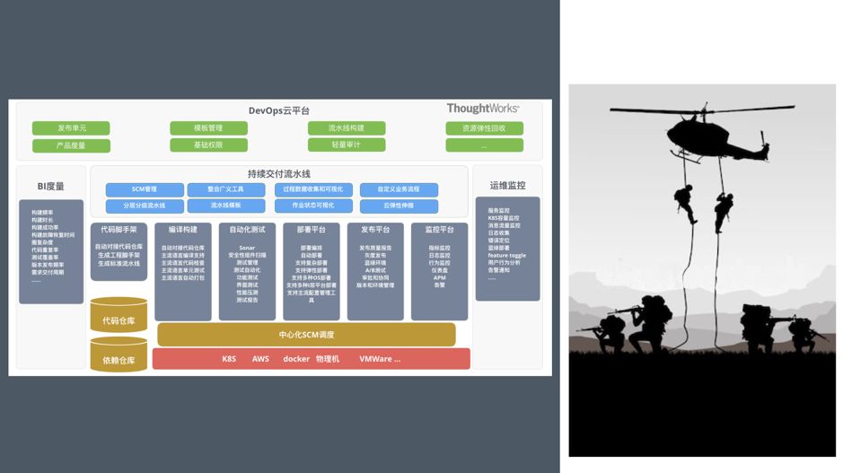 如果将技术中台比喻成前台特种兵的武器装备,那效能中台就是前台特种兵的管理训练基地以及可以快速将战士运送到一线战场的机动运输部队。
