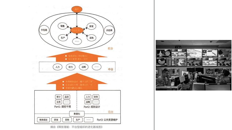 组织中台很像企业中的内部风投和创新孵化机构,为前台组织和团队构建创新型前台应用提供类似于投资评估(项目甄别)、投资管理、投后管理(孵化与风控),真正从组织和制度上支撑前台组织和应用的快速迭代规模化创新。