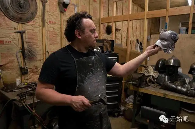 护甲大师Ugo Serrano在他的家庭工作室中,他自己的全套盔甲花费了200多个小时,光这个头盔就做了40多小时。