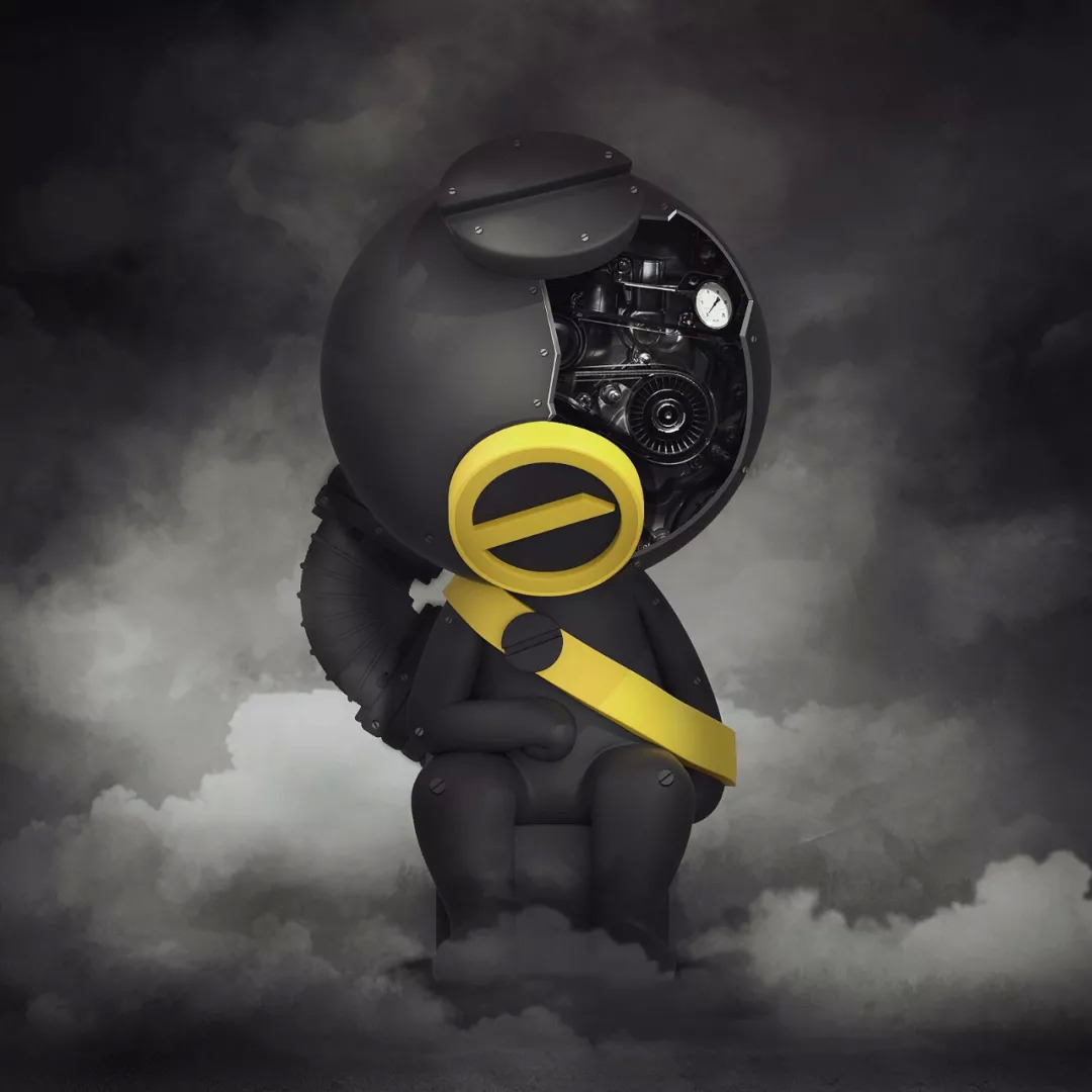 另一方面,他又形似潜水员,他的潜水镜是一个类钉子的静止符,符号上也共用了钉子的符号造型。潜水员和静止符是希望远离社会的象征,不安于舍弃自我融入社会,渴望静谧,倾听来自内心的声音。