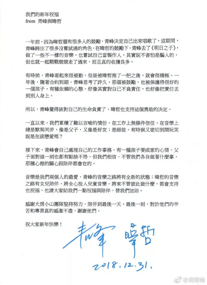 12月31日下午,吴青峰联合其经纪人林暐哲在其本人微博发布长文,宣布双方合约到期,未来吴青峰将独自处理工作事务。在文中,吴青峰感谢了林暐哲多年来对自己的照顾,并称不续约是在双方同意的条件下共同作出的决定。