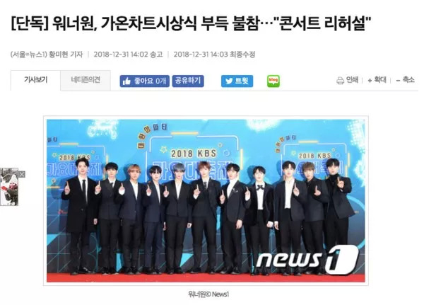 韩媒《news1》31日报道,Wanna One与SWING ENTERTAINMENT的合约在12月31日正式到期,MBC歌谣大祭典将是他们最后出席的公开典礼。至于1月金唱片典礼、首尔歌谣大赏,他们是以延长合约的名义参加典礼。随着他们解散的日子倒数,官方日前宣布将在1月24、25、26、27日连续4天举办告别演唱会。