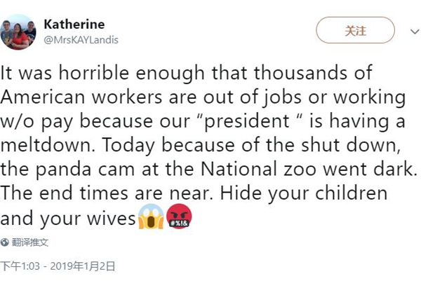 因为我们的“总统”崩溃,导致成千上万的美国人没法工作或者无薪上班已经够可怕了。因为停摆,今天国家动物园的熊猫直播也变黑了。末日要来了。把你们的孩子和老婆藏好。