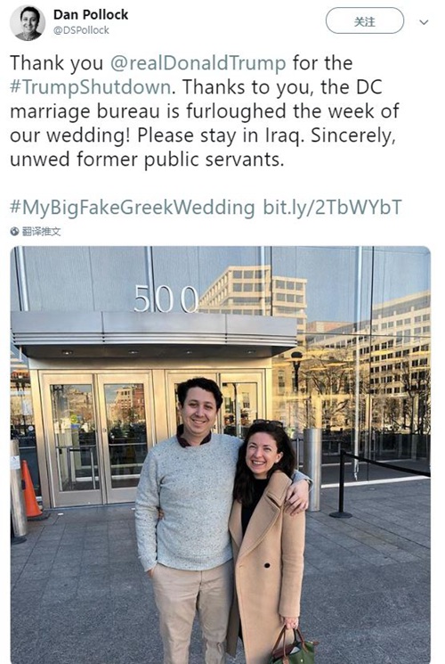 为#特朗普停摆谢谢你,特朗普。多亏你,华盛顿婚姻登记处在我们婚礼的这周不上班!请你留在伊拉克。你真诚的,没能结婚的前公务员。