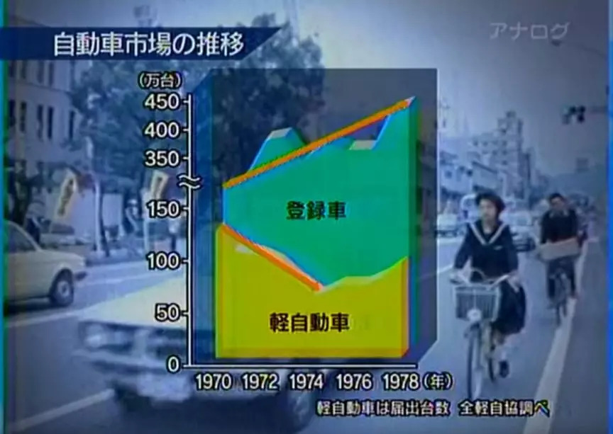 与此同时K-CAR的销量也从70年最高的123万台降低到了75年的56万台。但是汽车的总销量却在不断提高。当时的人们更倾向于购买普通车辆,同时由于政策调整,K-CAR的价格优势也缩小了。