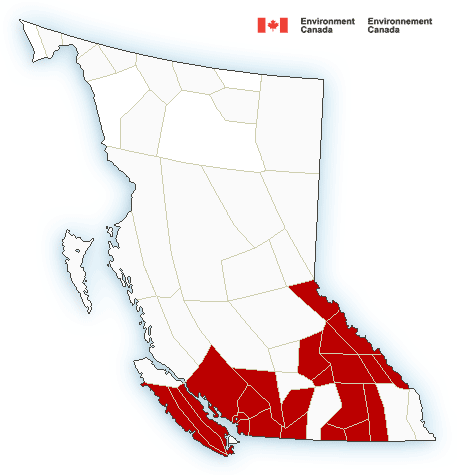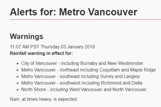 加拿大环境局今天连环多发数个天气警报,几乎将卑诗南部全部覆盖了。