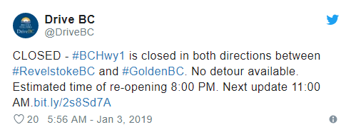 今天凌晨,公路局还发布了一项紧急通知:因为雪太大,为规避雪崩风险,1号高速Revelstoke与Golden之间的路段封闭,重开时间可能要到晚上8点。