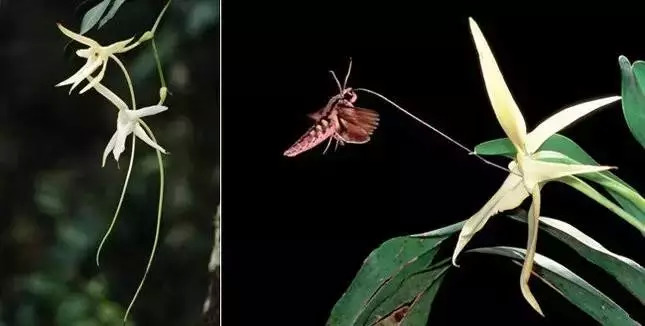 ▲彗星风兰的花朵,以及正在试图取食蜂蜜的天蛾Xanthopan morganii praedicta。