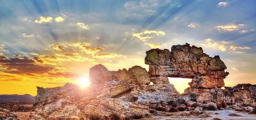 透过岩石框起的天然窗户欣赏暖红夕阳,充满原始震撼的荒野之美。