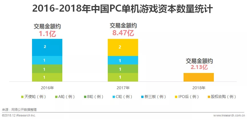艾瑞咨询认为,PC单机游戏产业链各环节活跃度较低,成本高变现难以及竞争优势不明显等原因,令资本对其热情不高。2018年随着游戏版号审批暂停,以及整个资本市场资金收紧等方面的影响,资本对PC单机游戏市场的投资更为谨慎。