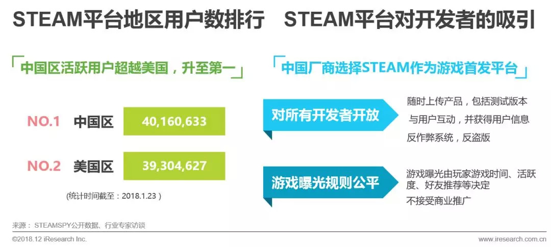 《绝地求生大逃杀》、《Dota2》等热门游戏,带动STEAM平台中国区玩家数量激增,目前STEAM平台中国玩家数量达到3200万人,数字还在增长中。STEAM平台游戏数量丰富,兼具开放性和公平性,使其成为中国玩家和开发者最喜爱的PC单机游戏平台。STEAM平台与完美时空达成合作协议,批准进入中国。