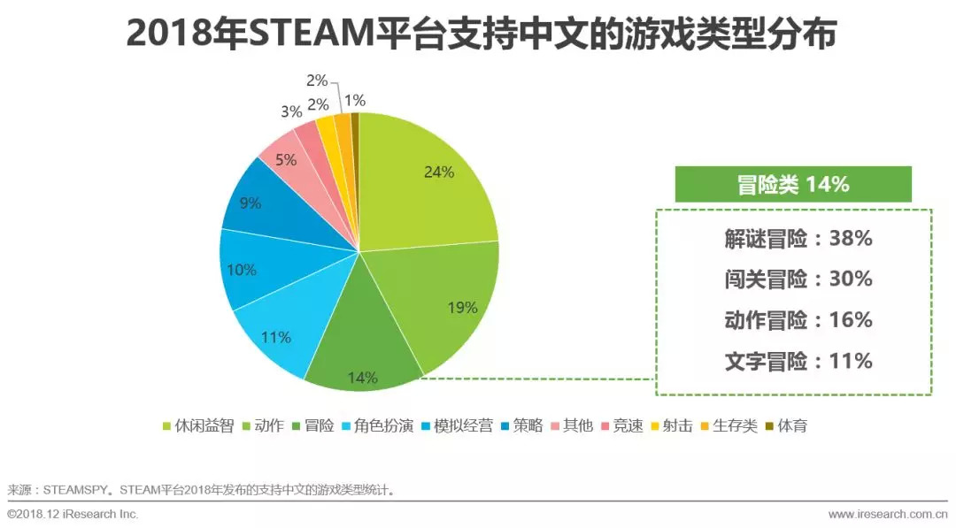 根据对STEAM平台2018年上架的支持中文的游戏统计来看,主要游戏类型分别是休闲益智、动作类和冒险类。冒险类游戏衍生出较多的细分品类,其中解谜类的冒险游戏占比较多。