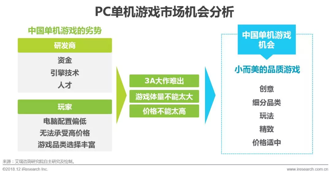 精致和创意是中国单机游戏的机会。中国单机游戏研发商普遍规模较小,资金不足,大型游戏引擎的技术与人才储备有限,国内具备3A级游戏大作经验与能力的PC单机研发商太少。同时,国内玩家普遍电脑配置低、玩家可承受购买价格不高以及网游选择丰富等都给高投入的单机游戏带来极大的成本回收压力。