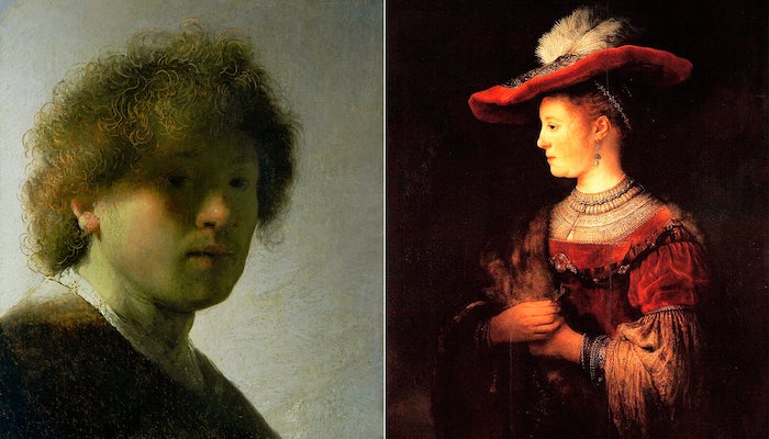 《扮作花神的萨斯基亚》(Saskia got up as Flora)完成于伦勃朗和爱妻的新婚之年,画中的萨斯基亚身着金色长袍,小腹隆起,手中怀抱着一簇盛开的鲜花。现实生活中,萨斯基亚的确怀有身孕,那是他们的第一个孩子:荣布塔斯(为纪念萨斯基亚的父亲)。然而,荣布塔斯在出生时不幸夭折,之后萨斯基亚虽顺利诞下两个女儿,却都在几天后不幸死去了。最终,他们的第四个孩子提图斯(Titus)终于活了下来,并在长大后子承父业,成为了一名画家。伦勃朗将提图斯的面容描绘得惟妙惟肖,他相貌英俊,却总是焦虑不安:做作业时,总是一副紧锁眉头苦思冥想的样子;在画室里,他又常常显得优柔寡断,犹豫不决。成年后的提图斯,拥有一头飘逸的长发和漆黑的眼眸,并且举止绅士,性格温顺。在对提图斯的面容进行刻画时,伦勃朗往往会倾注过多的情感,饱含爱意与质疑,一遍又一遍地进行润色。一位当代评论家曾经打趣说,这些画作辨识度是如此之高,甚至一眼就能够就认出来。