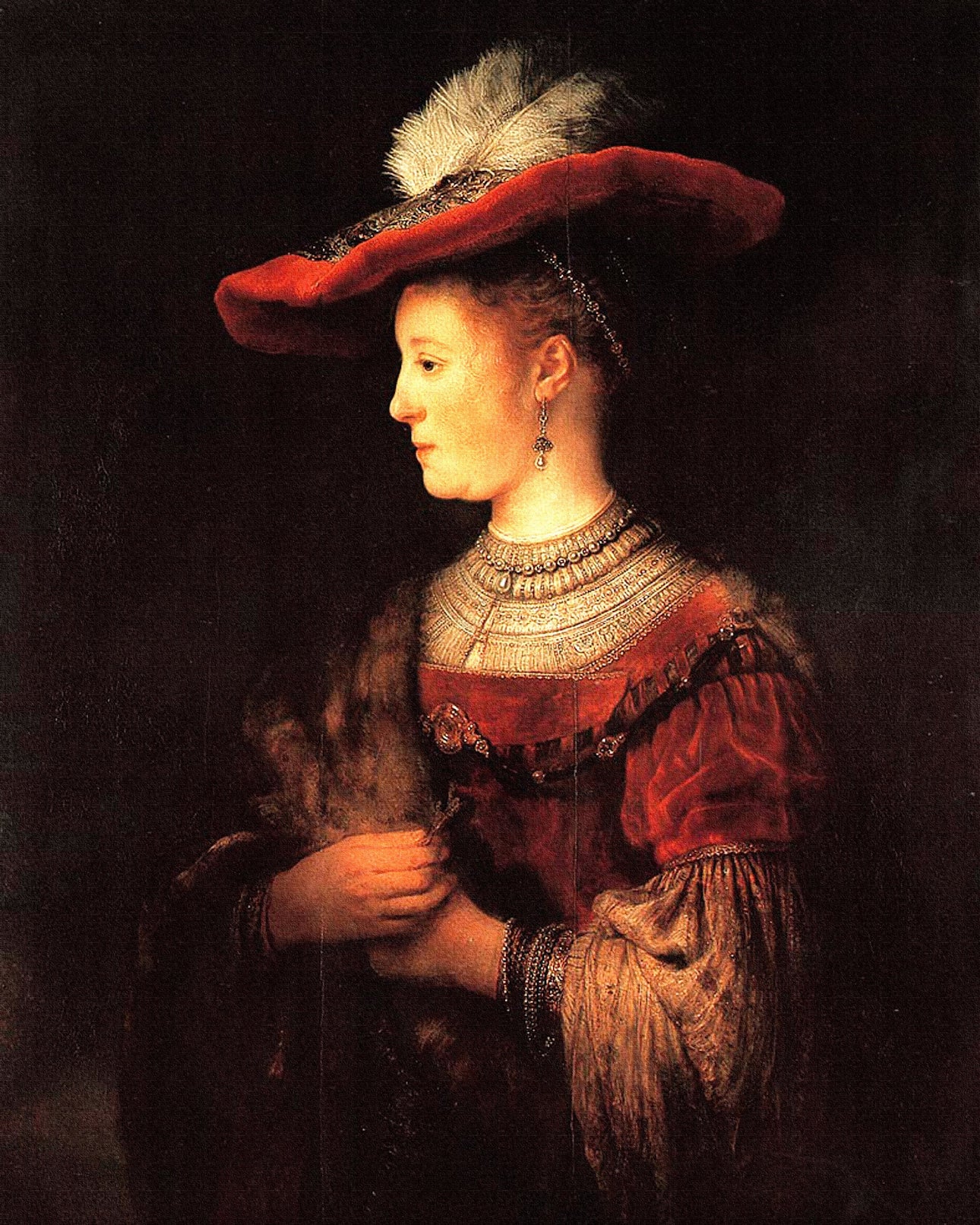 《萨斯基亚》的魅力令人痴迷:画中女子身着金红色相间的丝绒长袍,头戴一顶巨大而华丽的帽子,这也是伦勃朗唯一一次对爱妻的侧颜进行描绘。她看起来是如此娇嫩精致,红润的肌肤光彩照人,下嘴唇细腻而性感,脸颊洋溢着精明和稳重的智慧。在她去世前一周,萨斯基亚叫来了一位公证人为她立下临终遗嘱,后者的评价也再次证实了她的魅力:即使饱受病痛折磨,萨斯基亚仍然十分风趣,充满了智慧。