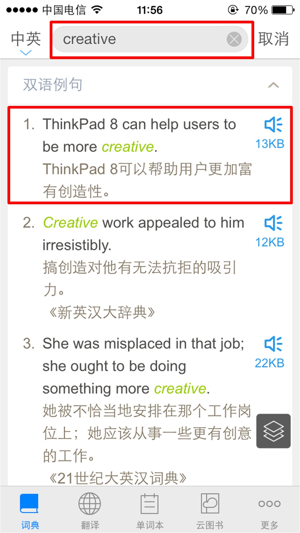 做有情感的数字营销,不应只是考虑数字广告和情感间的关联,还需要考虑到,用户在接收广告信息后,会产生怎样的情感波动,是欣然接受,还是拒之千里?近些年来原生广告作为与场景相融合的广告形式,深受广告主青睐,例如近期发布拥有5亿用户量的有道词典就曾与ThinkPad合作除了传统的弹窗和banner,ThinkPad原生广告最大特点便是与有道词典双语例句的内容进行了深度结合。用户搜索“creative(创造性的)”一词,有道随即给出内嵌ThinkPad的双语例句,将其工具性与商业性完美结合,是原生营销概念的经典诠释。