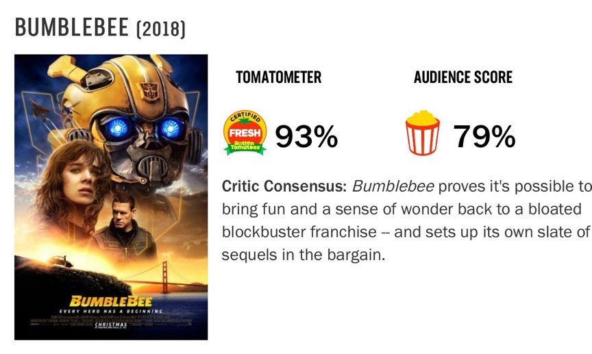 众所周知,《变形金刚》系列是最为明显的爆米花电影,但从第四部开始却偏了题,到了第五部,迈克尔·贝的狂轰滥炸式操作终于将该系列的口碑炸得一干二净。《大黄蜂》的出现对于变形金刚系列而言似是一次“拯救”,虽然目前来看只是口碑层面的。