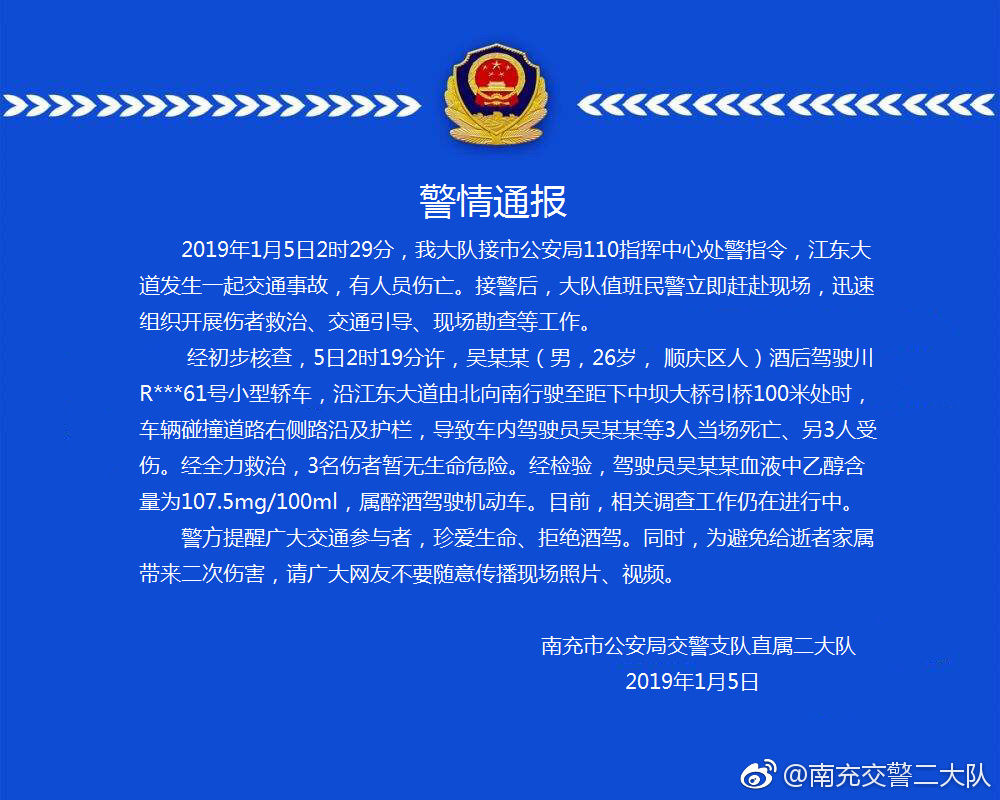南充交警二大队官微今日发布警情通报,1月5日2时19分许,吴某某(男,26岁,顺庆区人)酒后驾驶川R***61号小型轿车,沿江东大道由北向南行驶至距下中坝大桥引桥100米处时,车辆碰撞道路右侧路沿及护栏,导致车内驾驶员吴某某等3人当场死亡、另3人受伤。经全力救治,3名伤者暂无生命危险。经检验,驾驶员吴某某血液中乙醇含量为107.5mg/100ml,属醉酒驾驶机动车。目前,相关调查工作仍在进行中。