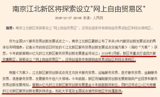 作为全国15个服务贸易创新发展试点之一,2016年年底,南京江北新区公布了未来2年内服贸创新发展试点的具体任务时间表。提出2018年2月前,南京江北新区将重点打造四大服贸集聚区,探索设立“网上自由贸易区”,还将创造条件申报自由贸易试验区和综合保税区。