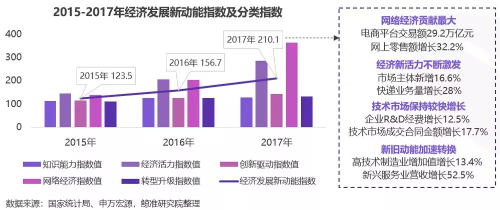 十九大报告指出:“我国经济已由高速增长阶段转向高质量发展阶段,正处在转变发展方式、优化经济结构、转换增长动力的攻关期。”2015-2017年,我国经济发展新动能指数分别为123.5、156.7、210.1,同比增长分别为23.5%、26.9%和34.1%,呈逐年加速之势,表明我国经济发展新动能加速发展壮大,经济活力进一步释放,成为缓解经济下行压力、推动经济高质量发展的重要动力。