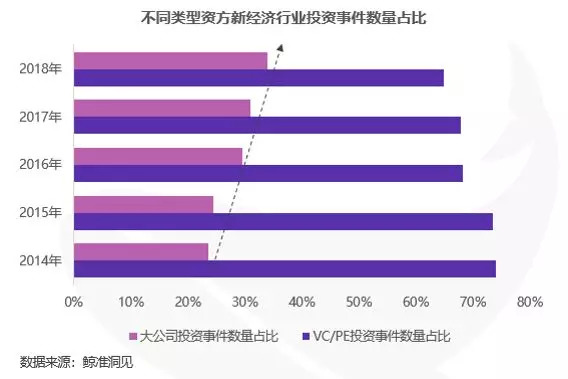2018年中国的股权投资市场正在经历周期性低潮,但鲸准洞见数据显示,相比VC/PE等投资机构,产业集团们正在加速布局自己的新经济投资地图,今年大公司投资事件数量占比与2017年相比,上升了近3个百分点,与2014年相比,上升了近10个百分点。