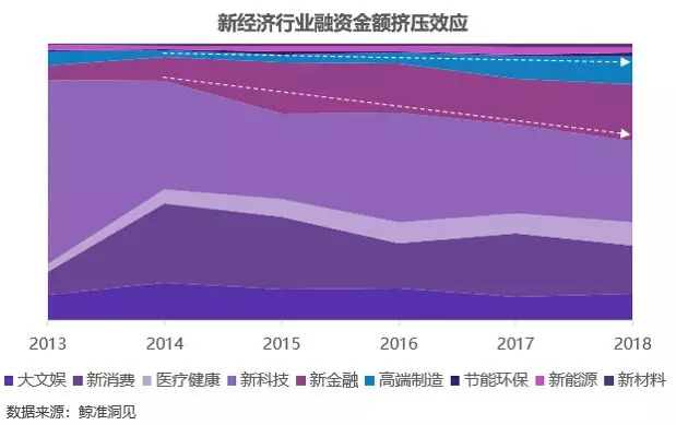 从整个新经济行业的融资挤压效应来看:新科技行业虽整体融资占比最大,但占比显著收窄,资本流入趋于理性;新消费、医疗健康和大文娱行业在稳定中小幅波动,而新金融和高端制造行业在2017-2018年增长挤压效应明显。