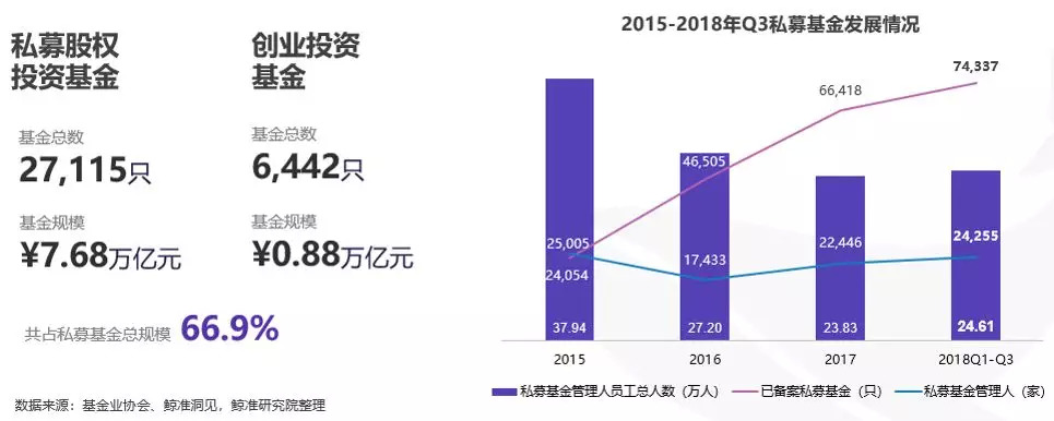 根据基金业协会及鲸准洞见数据显示,截至2018年11月,在中国证券投资基金业协会登记的私募股权与创业投资基金管理人14,676家,管理基金33,557只,管理基金规模8.56万亿元;股权、创投私募基金规模已经占到私募基金总规模的67%左右。