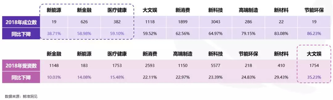 新能源作为传统行业转型的一大重点布局方向,相较去年下跌幅度最小;而新金融和医疗健康近年资本始终活跃,即使在调整期内也聚集了大量投融资;这三个行业,不论从项目成立数还是项目受资数来看,都成为了“抗寒”的第一梯队。此外,大文娱由于政策敏感性高、商业模式回归理性,较去年波动浮动最大;而新消费行业由于直击最底层生活需求,也不失为各大机构在寒冬中防守的一张好牌。