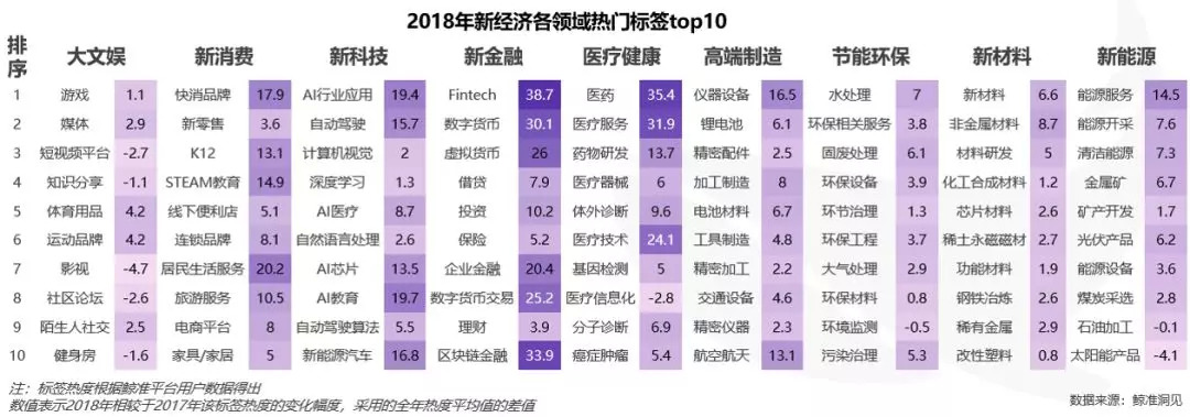 2018年各领域的热门标签top10相较于去年,整体上增幅变化不大,大部分热门标签热度相较于2017年呈增长态势,少数标签出现了负增长。从增幅上来看,新金融和医疗健康热门标签的波动最大,受今年前半年区块链热潮的影响,金融领域与区块链相关的标签关注度大幅上升。