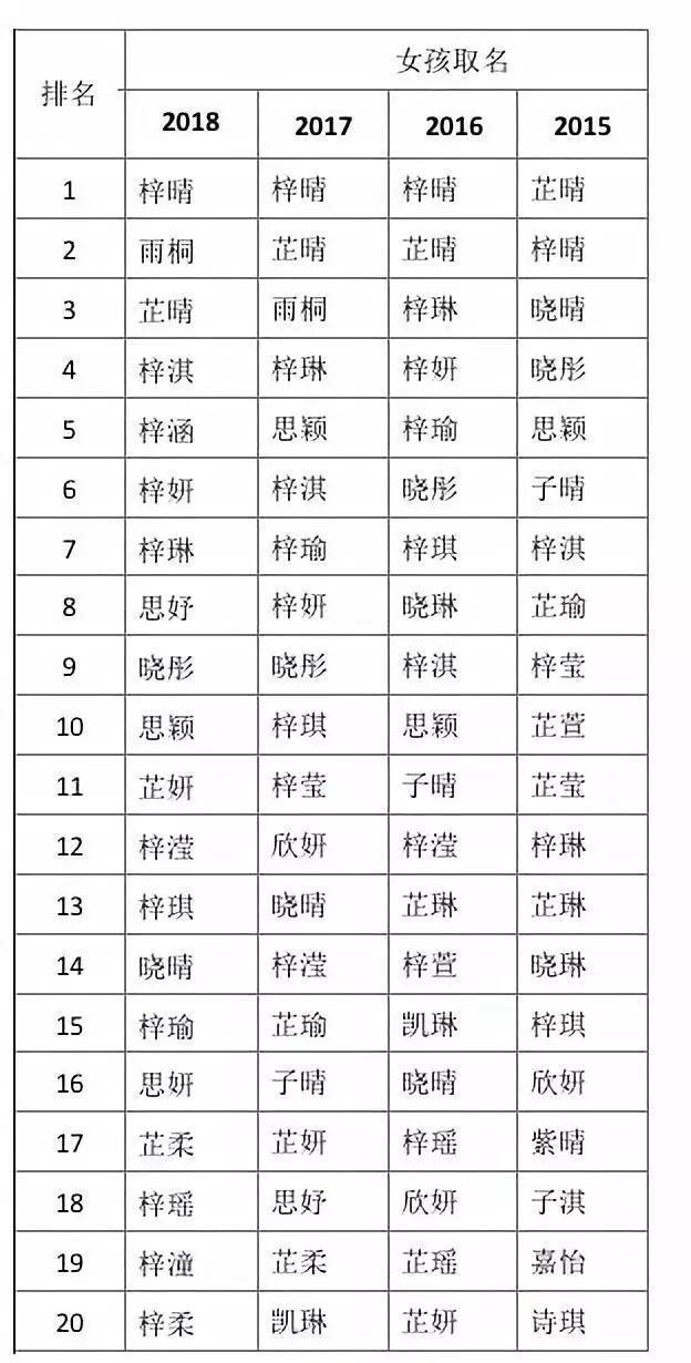 女孩取名最多的是已经连续3年排行榜首的梓晴!约1000个新生女孩中有2人。