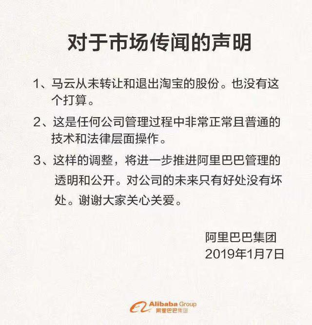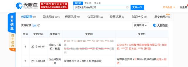 2019年1月7日,今日有媒体称:1月4日,国家企业信用信息公示系统显示,马云和谢世煌退出浙江淘宝网络有限公司(淘宝网络)股权备案,新增杭州臻希投资管理有限公司(杭州臻希)作为唯一股东。淘宝的法人也由阿里集团CEO张勇取代。