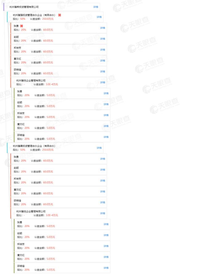 据天眼查的资料显示,杭州臻希由杭州臻强投资管理合伙企业(杭州臻强)和杭州臻晟投资管理合伙企业(杭州臻晟)各认缴250万元注册资本,持股50%。张勇、赵颖、郑俊芳、童文红、邵晓锋5人各持有杭州臻强和杭州臻晟20%股份。