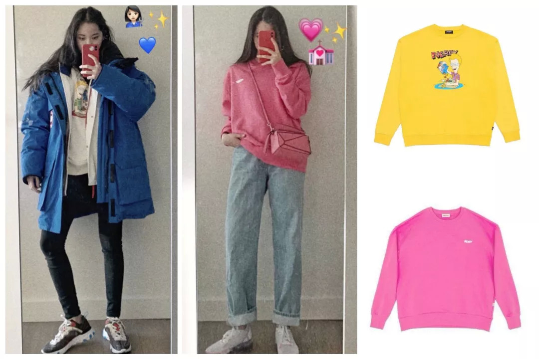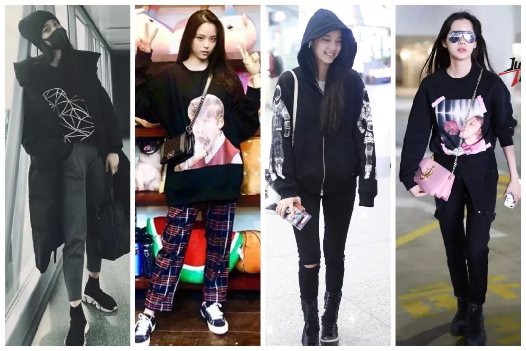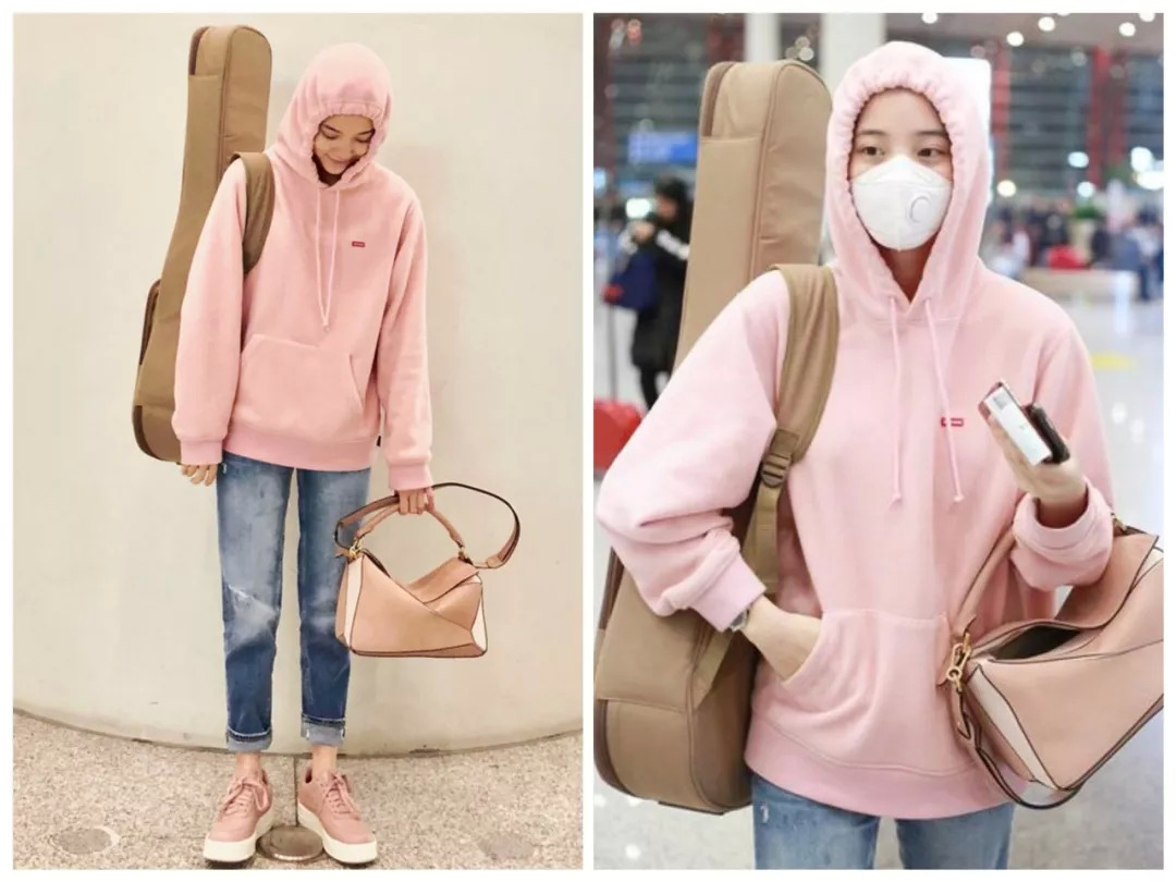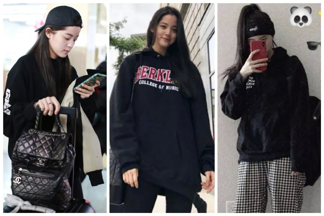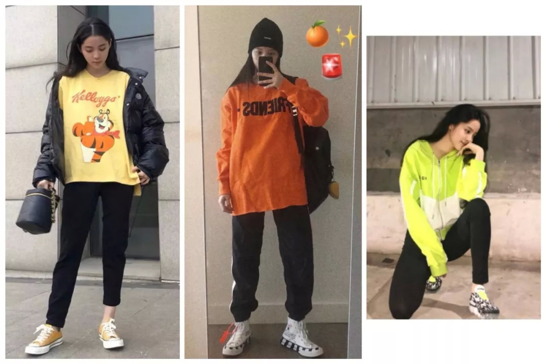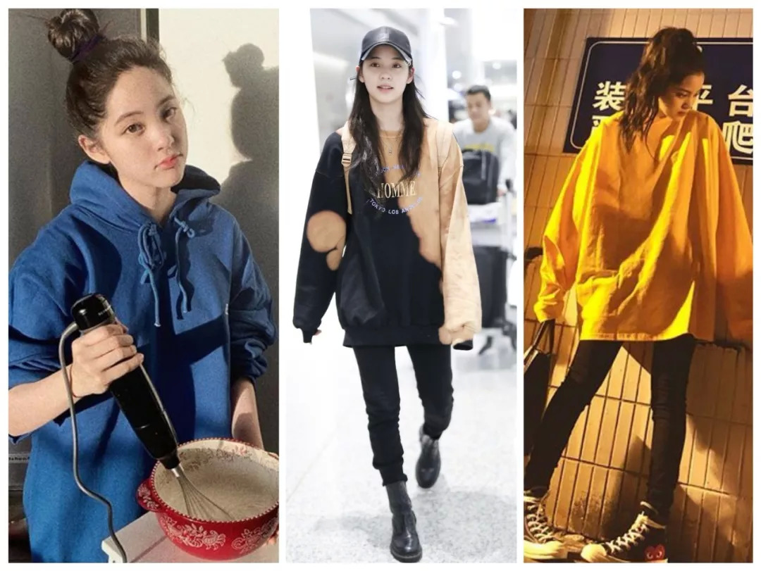 除了黑色,娜娜还穿过好多彩色卫衣。粉色、紫色、拼色,啥都有。