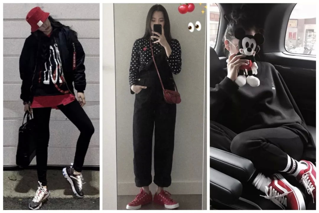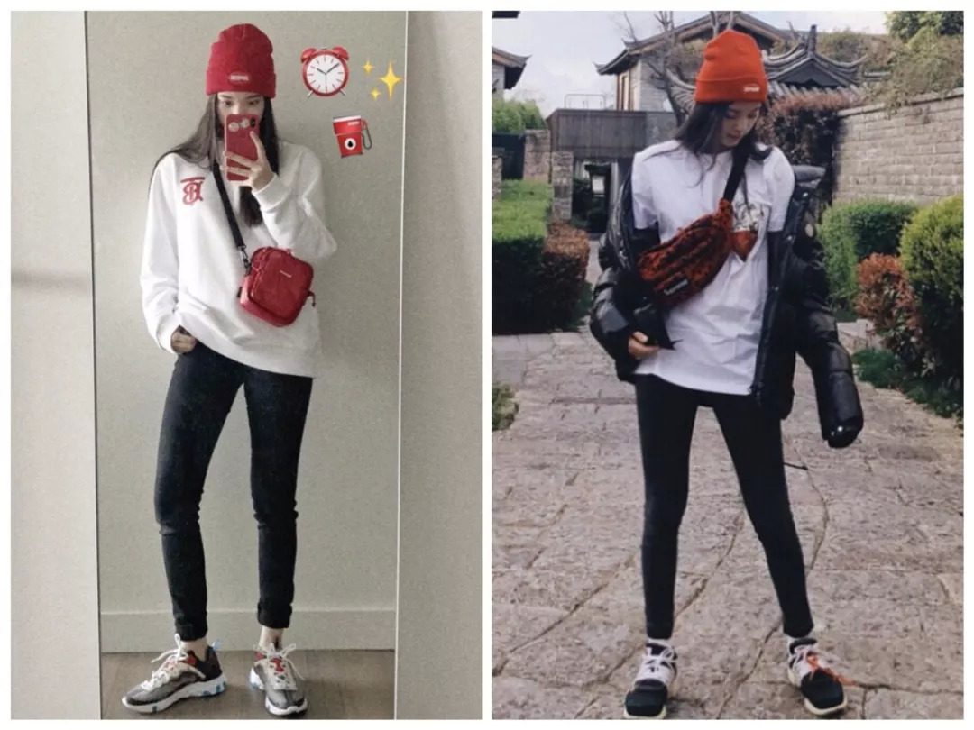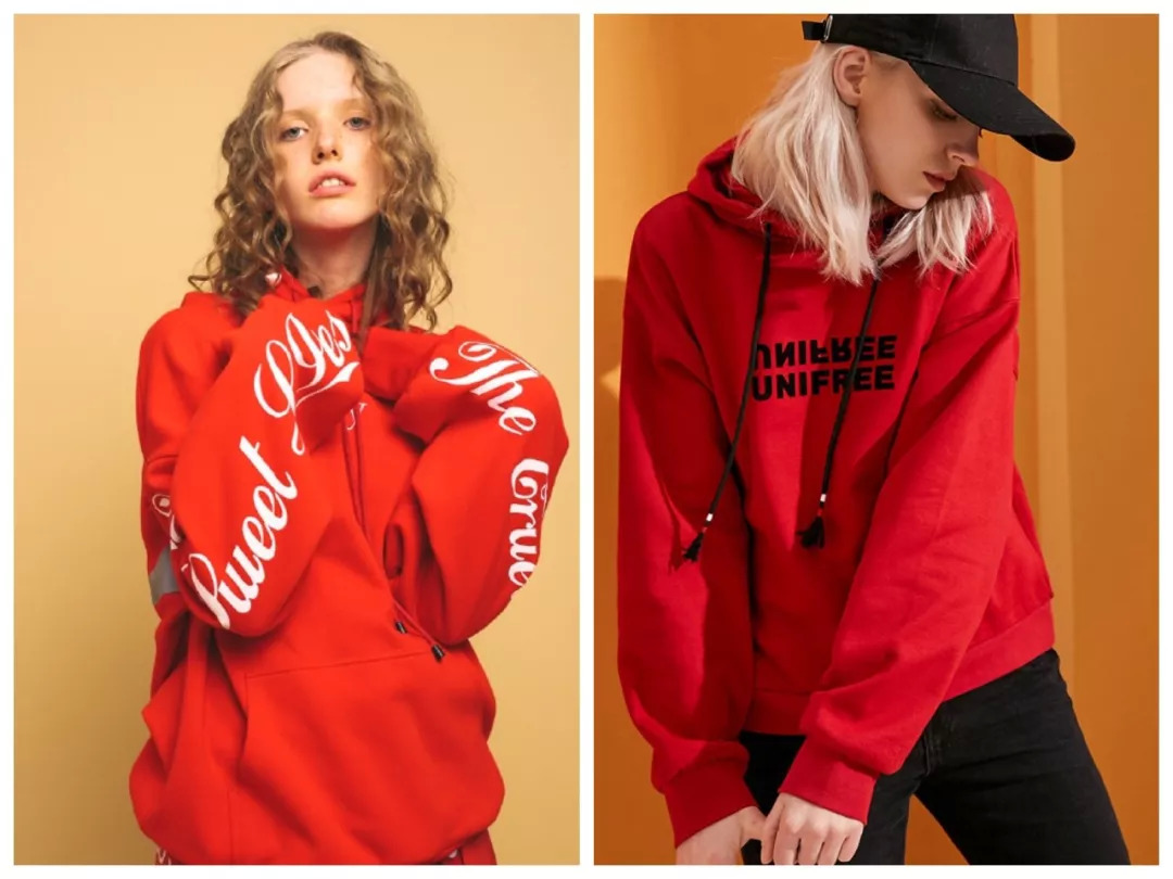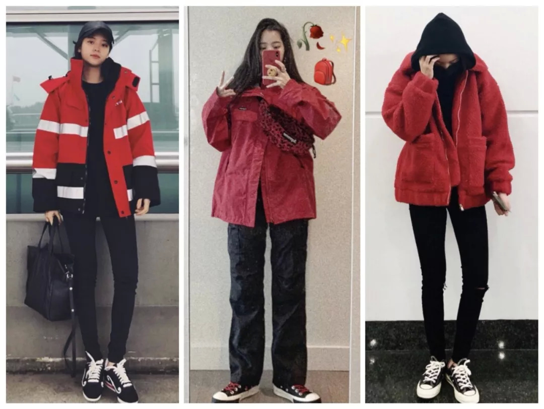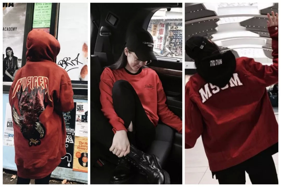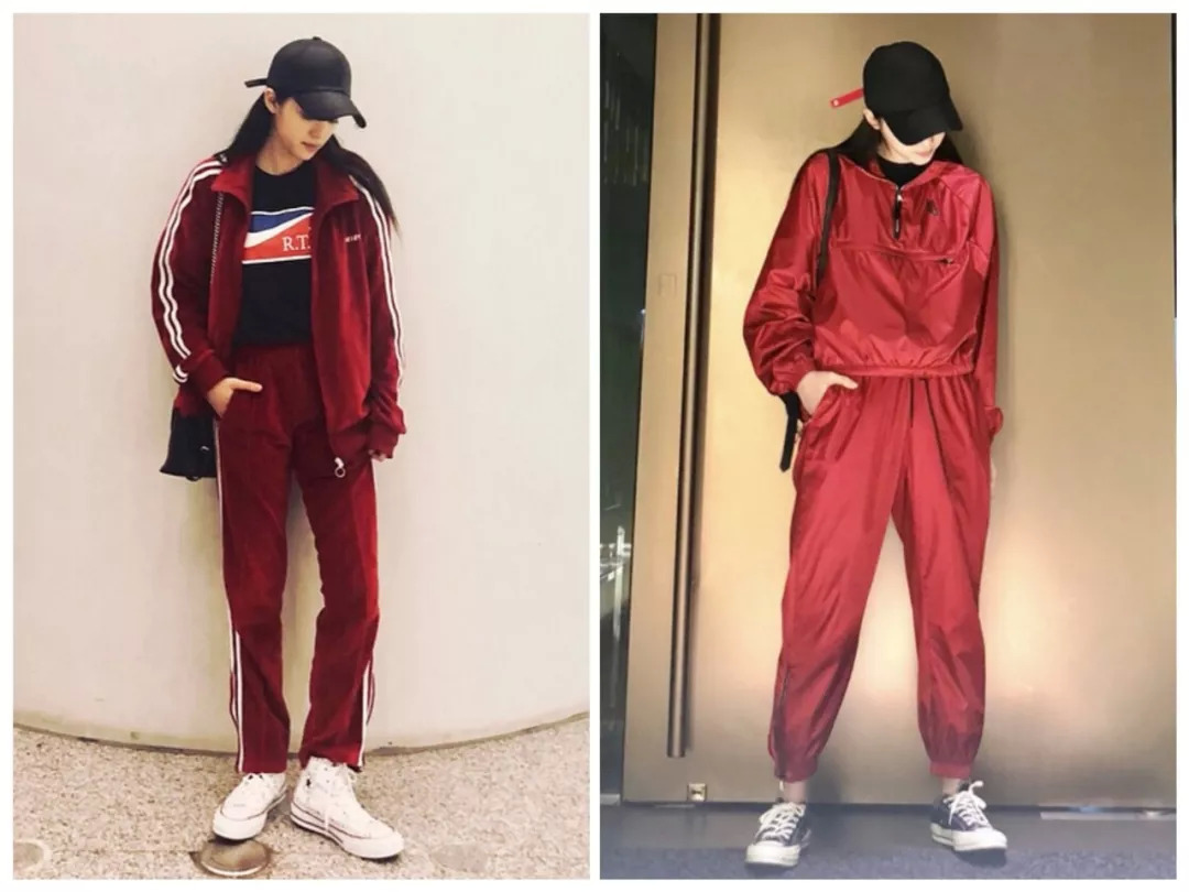 红色卫衣+黑色裤装。保证了活力感,同时对下半身粗壮的妹子更友好。
