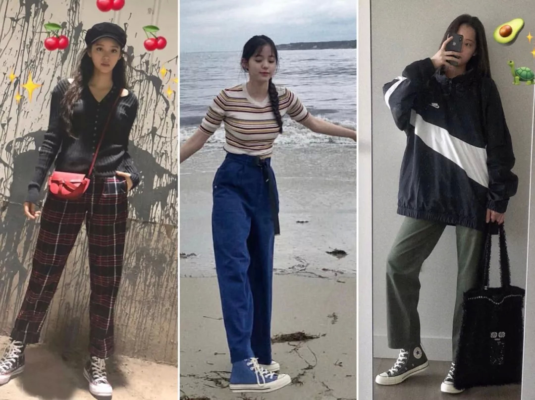 普通身材,Miss 烧饼更建议用直筒/宽腿/工装裤,搭配高帮帆布鞋,把细细的脚踝凸显出来,才更加显瘦。
