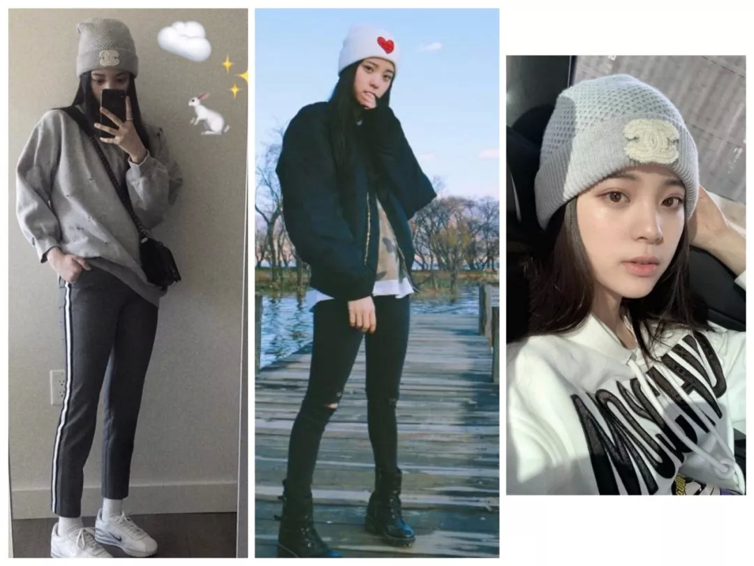 除此之外,爱心元素、香奶奶双C针织帽她也都戴过。配上她精致的五官和长发,保暖又打眼。