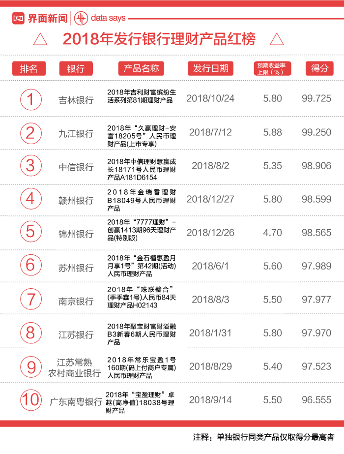 界面新闻根据自己制作的一个涵盖数万只理财产品的数据库,对满足筛选条件的理财产品进行评估与排行。该数据库在衡量当期宏观经济、行业水平、银行自身风险、产品属性后选出性价比最高和最低的产品,其挑选范围是全国及全行范围发售的信息披露充分的非结构类理财产品,最终形成年度产品红黑榜。