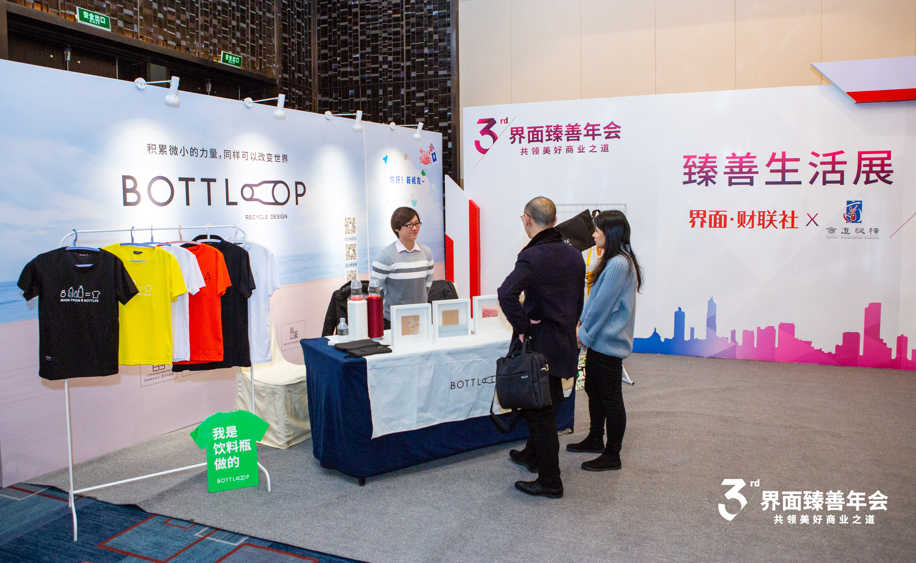 年会场外的臻善生活展由界面·财联社携手商道纵横一同发起,展览以可持续生活为场景,邀请到亚马逊中国、零活实验室、Bottloop等参展企业与机构。其中零活实验室与Bottloop分别从资源再生、材料替代的角度,为我们展现了在新兴技术发展的助推下,人们对资源的循环利用。展览中展示的布袋、衣物等生活物品,均是利用回收的废弃物制成,这些物品向人们展示了一种绿色生活方式。在亚马逊中国的展示区,人们看到企业可通过自身产品和发展优势,探索教育资源再分配的可能性。