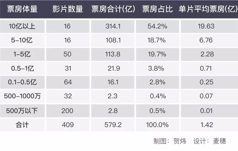 2018年共有1923部影片显示有放映记录,剔除1365部票房不超过10万的影片,27个电影节票房记录,20部无明确上映时间的影片及102部非本年度上映影片后,剩余409部本年度上映的影片共产生票房579.2亿。本文所有的分析基于这409部新片,而非本年度的所有影片。