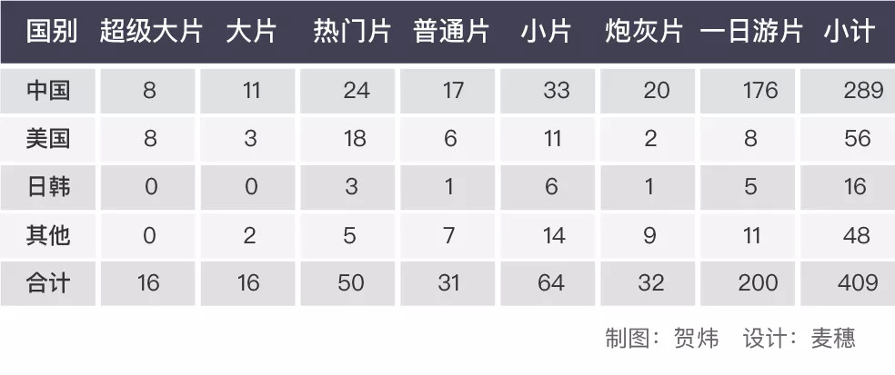 若将但凡有中国参与合拍的影片都算国产片,将美国主导的影片算作美国片,日韩主导的影片算作日韩片,剩下的算其他片。那么,除了289部国产片外,美国片、日韩片和其他片的数量分别为56部,48部和16部。