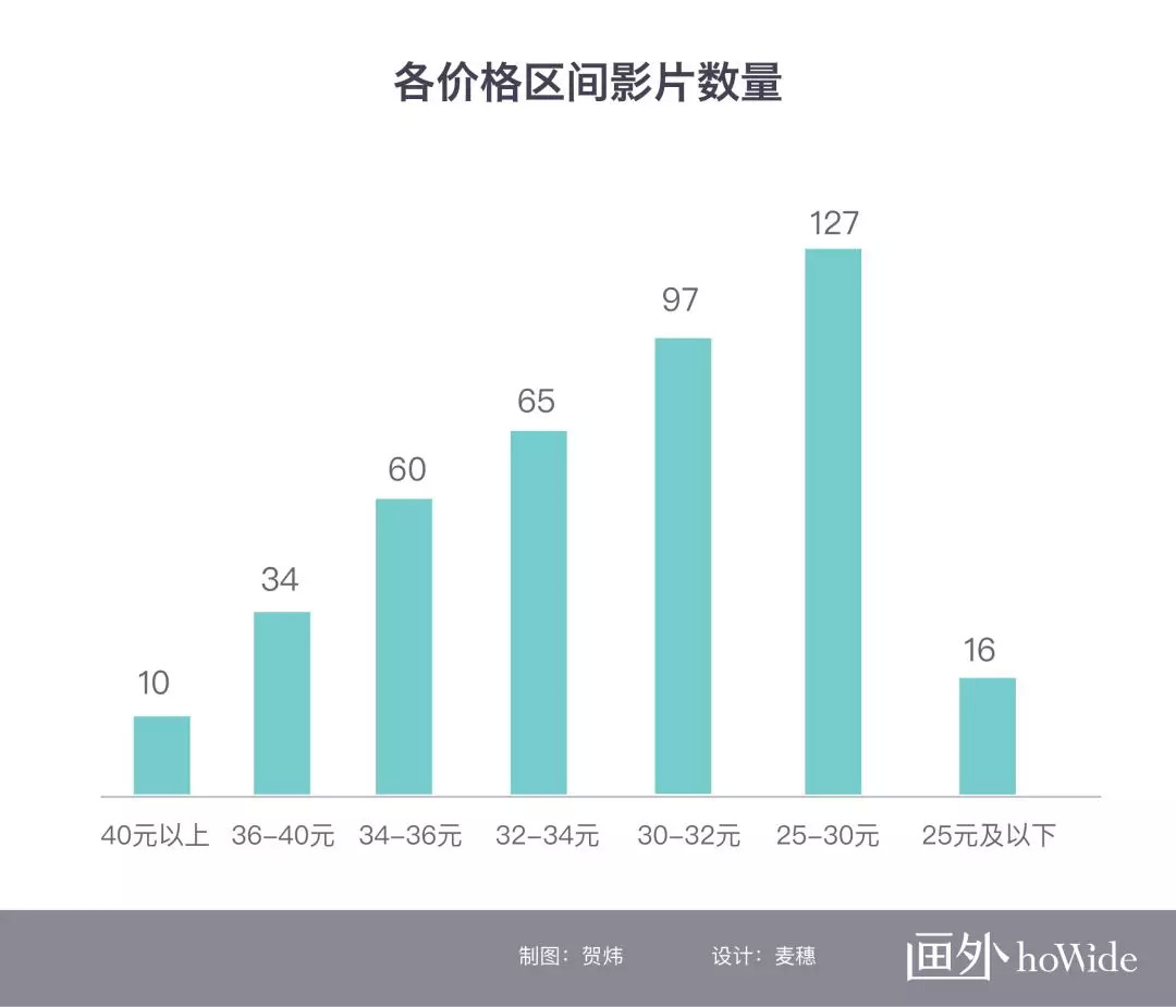 超低票价的影片也不多,均价低于25元的影片只有16部,全为国产片。《梭哈人生》以17.1元的均价排在最后。这些影片中票房最高的是《开学季》,为137万。大量影片的均价位于25-30元之间,数量多达127部,但它们只产生了7.3亿票房,单片平均票房低至572万,接近炮灰级别。