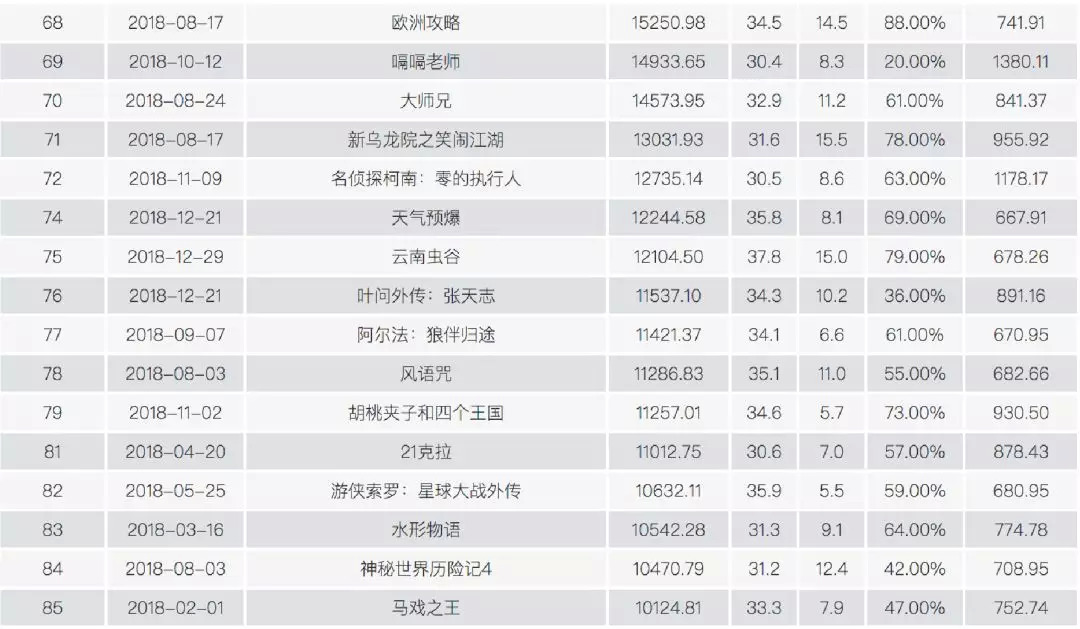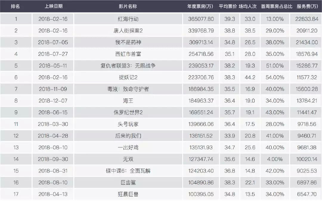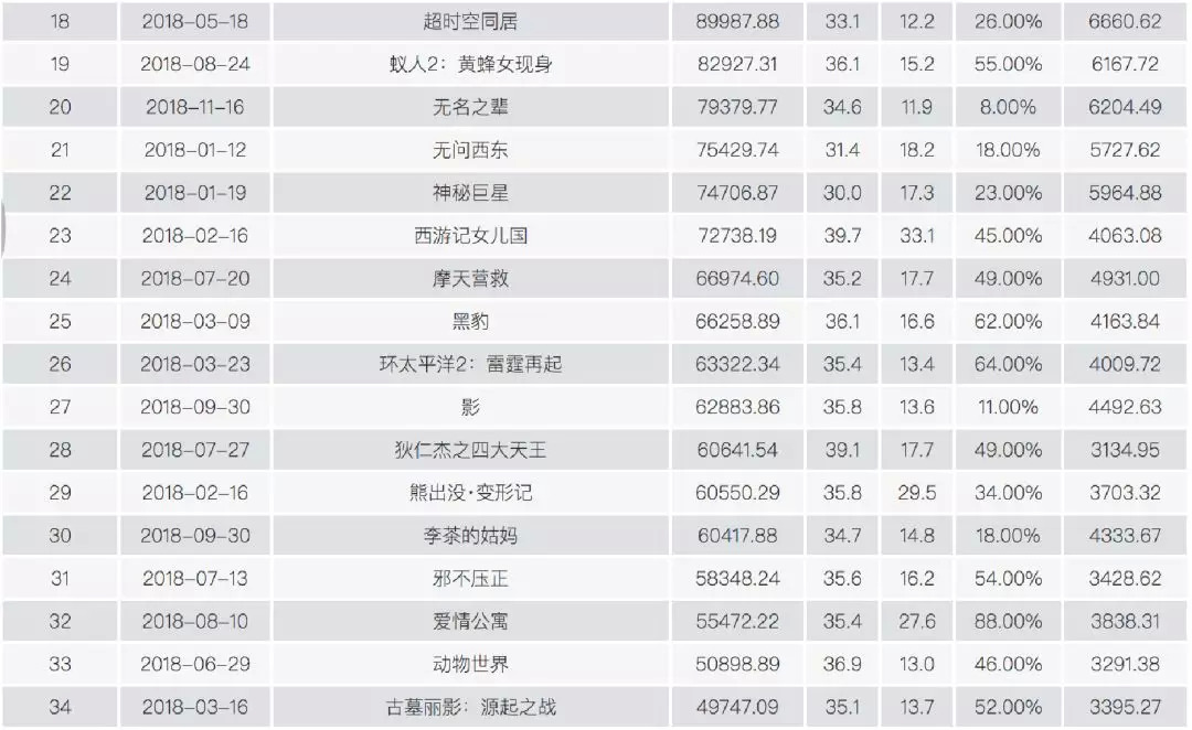 首周票房占比低于20%的影片有63部,其中票房过亿的只有11部,其他大多数票房不足千万。在11部过亿的影片中,《红海行动》《无问西东》《无名之辈》和《无双》这种口碑佳片赫然在列。当然,《李茶的姑妈》和《胖子行动队》也在里面,纯粹是因为他们在周日上映,与影片质量无关。