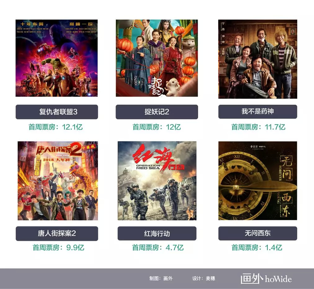 《复联3》《捉妖记2》和《药神》的首周票房都超过了10亿,分别为12.1、12和11.7亿,《唐探2》的首周票房也高达9.9亿,它们都是首周票房与总票房正相关的例子。其中《捉妖2》和《复联3》的首周票房超过了总票房的50%,《药神》和《唐探2》的首周票房占比也达到了38%和29%。理论上讲,30%-50%的首周票房占比是比较正常的水平。